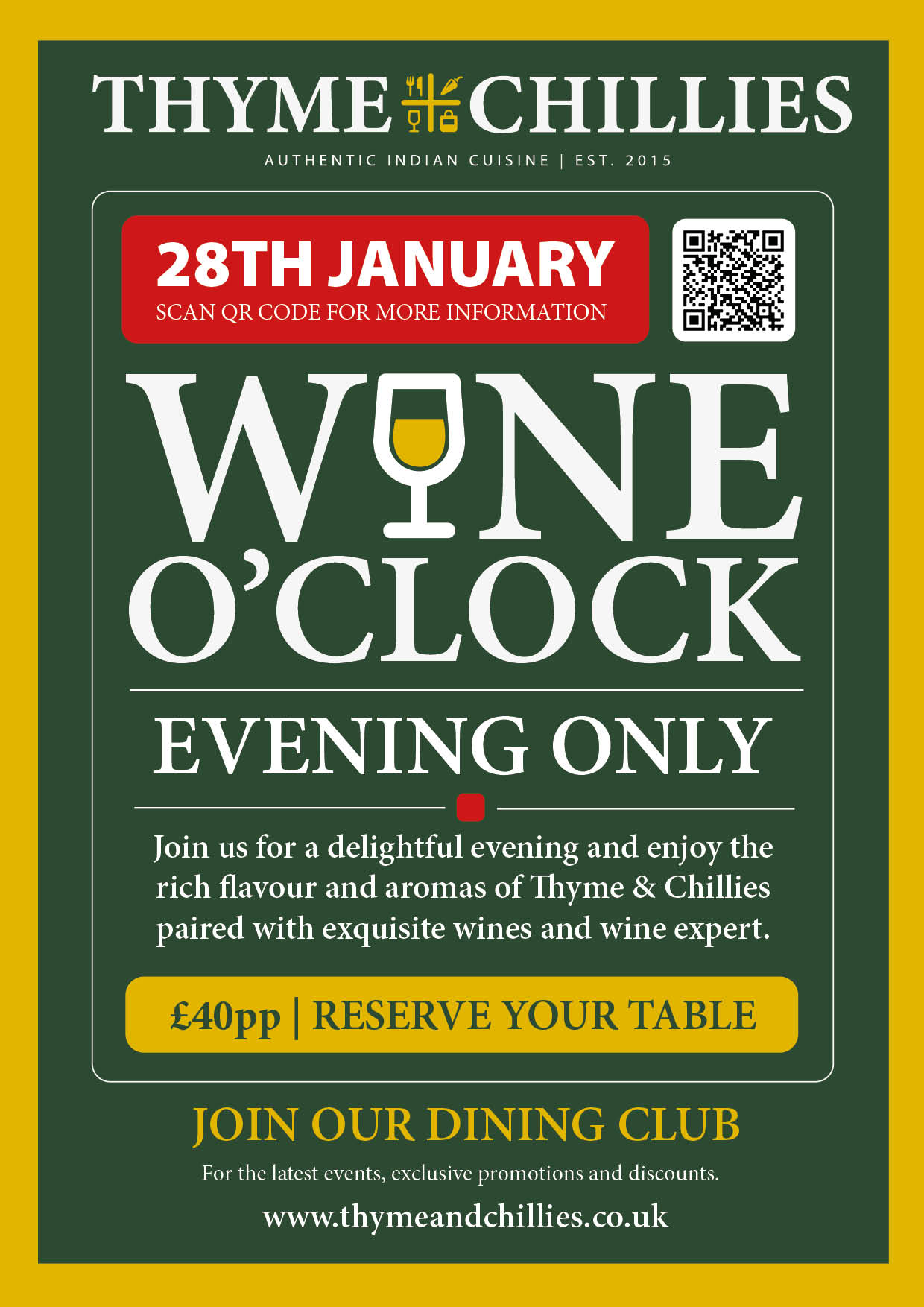 Join us at Thyme & Chillies on Wednesday, 28th January from 6pm for Wine O’Clock—a special evening where authentic Indian cuisine meets exceptional wines. This exclusive £40-per-person event features a 5-course set menu, each dish thoughtfully paired with wines selected by Ellis Wines, one of the UK’s most respected family-run wine specialists since 1822.